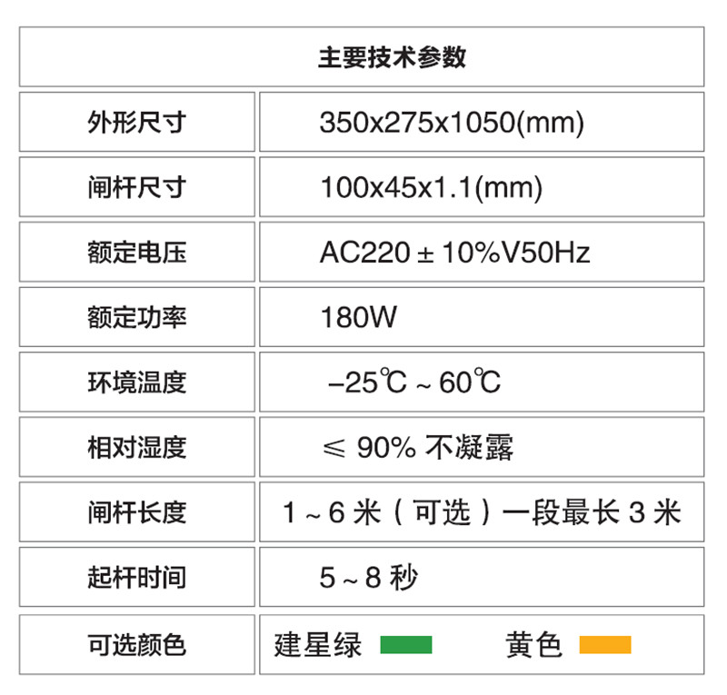 9.閘桿升降平穩(wěn),可靠、升降時間為2-6秒。