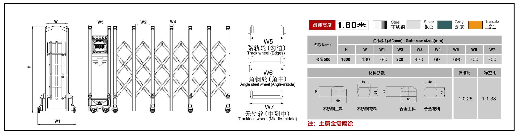 3.選材用料精良:不銹鋼產(chǎn)品全部采用高銅不銹鋼型材,品質優(yōu)良,鋁合金型材在頭部和底部連接件全部采用高強度鑄鋁件,不僅美觀大方,更加經(jīng)久耐用,更好的延伸伸縮門使用壽命。
